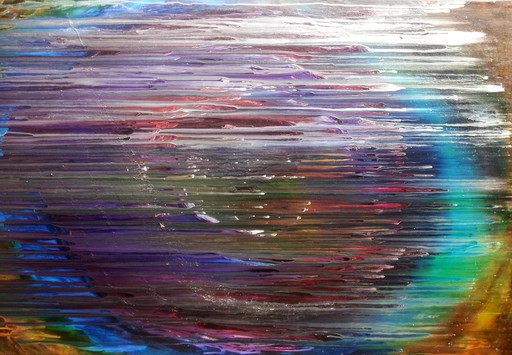 His abstract paintings contains various intense colors where in he uses mixed media like transparant oilpaint, acryl, spraypaint, gold, silver and bronse pouders and leaves.